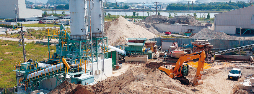 コンクリートガラ・アスファルトガラ・固定汚泥等の産業廃棄物を建設資材へ変換。
